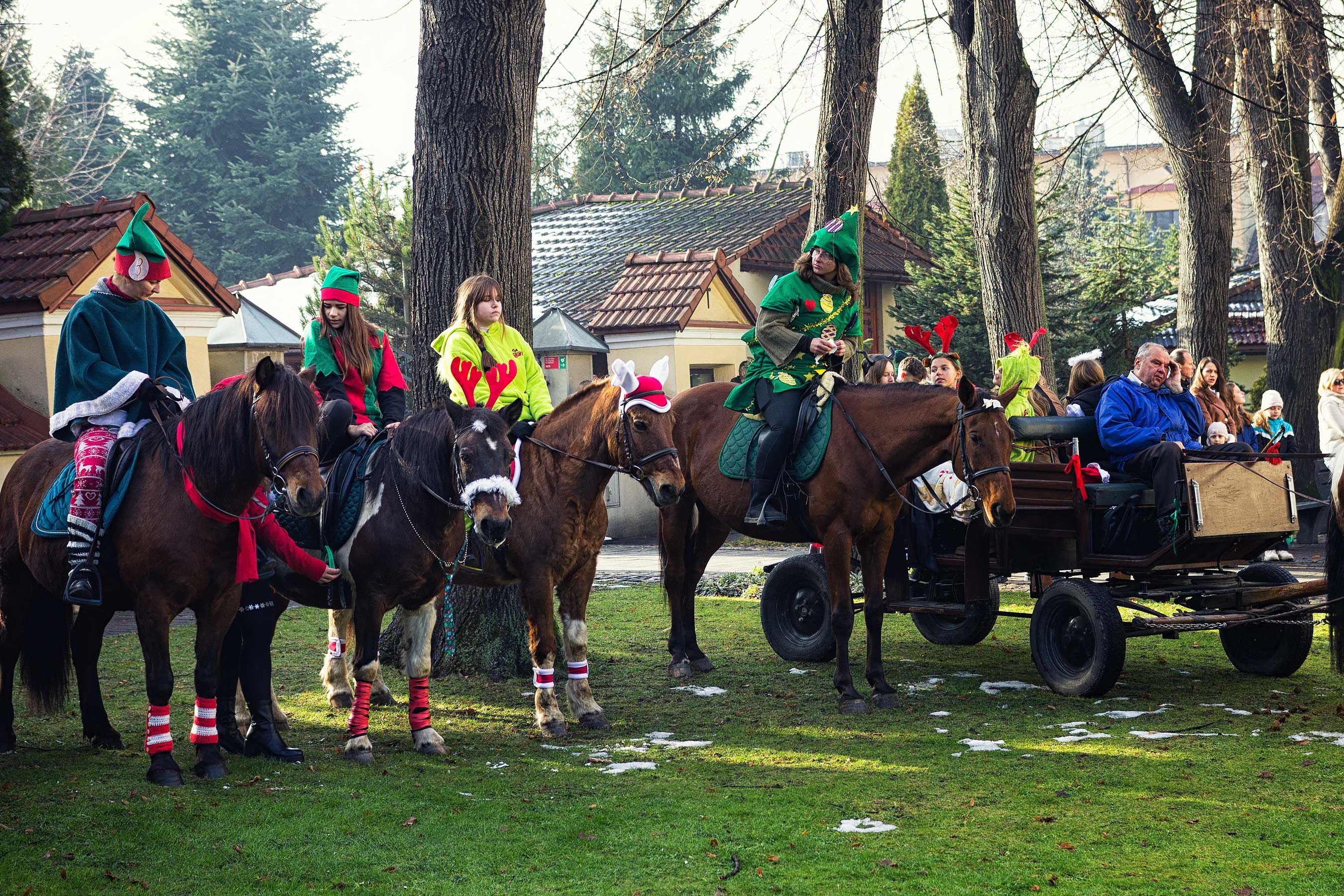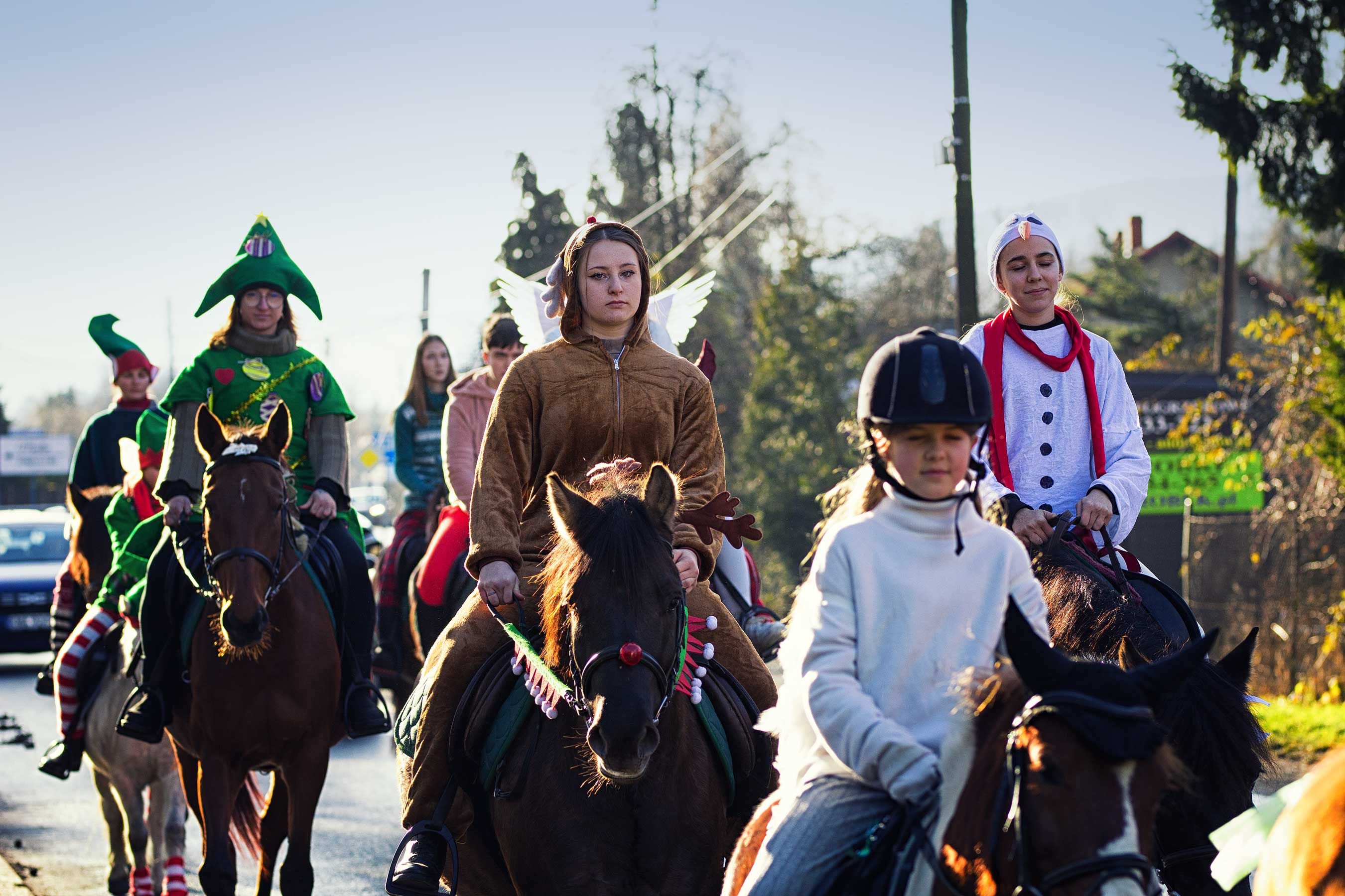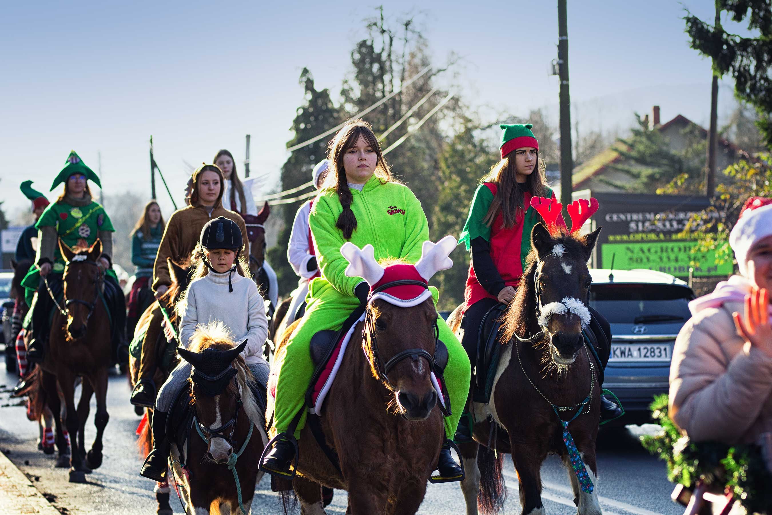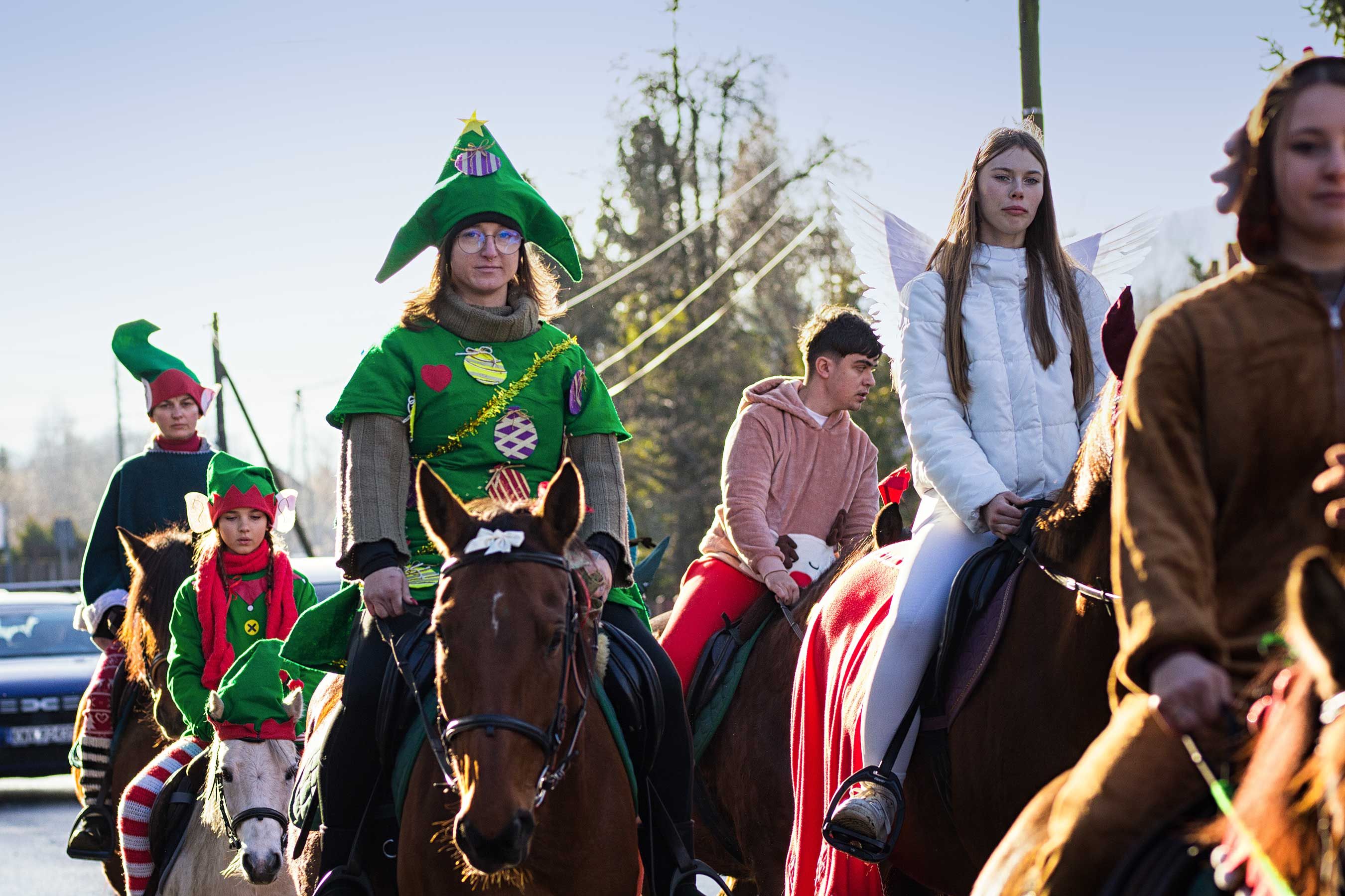 Jak co roku uczestnicy orszaku wyruszyli spod stanicy, skąd w barwnym korowodzie udali się w stronę kościoła św. Macieja w Andrychowie. Cała grupa prezentowała się niezwykle efektownie – jeźdźcy przebrani byli w świąteczne stroje: elfy, renifery, anioły. Również konie udekorowano w bożonarodzeniowe akcenty, co tworzyło niezwykle ciepłą i magiczną atmosferę.